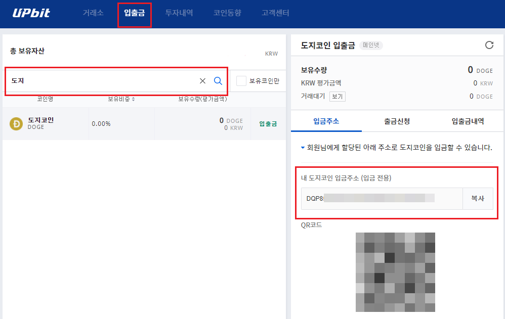 업비트 아이디를 생성해서 로그인해주시고 입출금 -> 코인 검색창에 '도지코인' 검색 ->